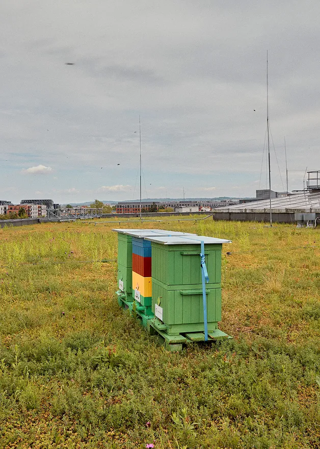 Diamante Plaza office building and beehives on the roof, 2024–2025